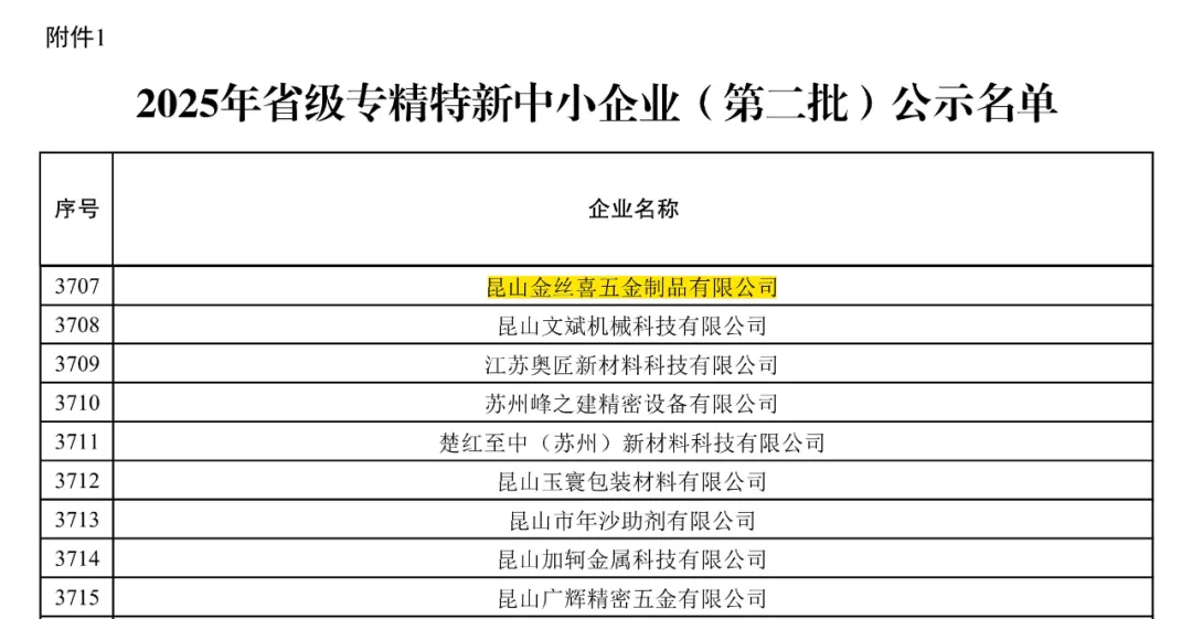 Slovenski Kürzlich gab das Ministerium für Industrie und Informationstechnologie der Provinz Jiangsu offiziell die neuesten Auszeichnungen für spezialisierte und hochentwickelte KMU aus Jiangsu für 2025 bekannt. Kunshan Jinsixi Metalware Co., Ltd. wurde erfolgreich ausgewählt und mit dem Titel „Jiangsu spezialisierte und hochentwickelte KMU“ ausgezeichnet, aufgrund seiner tiefgreifenden technischen Kompetenz, hervorragenden Produktqualität und kontinuierlichen Innovation im Teilsektor Verbindungselemente.